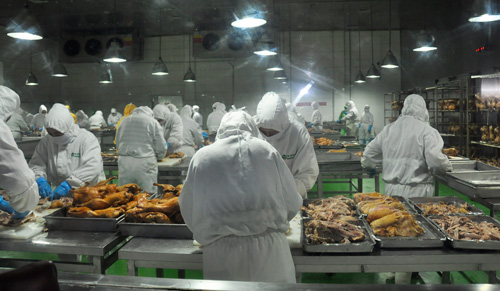 绿源食品有限公司成立于2001年,十余年已蓬勃发展成集养殖、加工、销售、出口为一体的农业产业化国家重点龙头企业。鸭业协会考察团兴致勃勃地参观了绿源公司的冷藏加工厂和熟食加工厂,并和生产管理人员进行广泛交流。