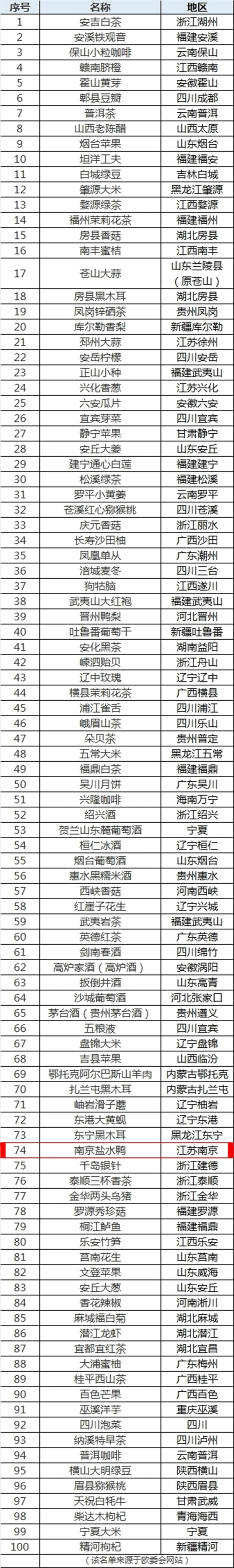 欧盟理事会当地时间7月20日作出决定,授权正式签署中欧地理标志协定,在中国境内的100个欧洲地理标志产品和在欧盟境内的100个中国地理标志产品将受到保护。四年后,协定范围将扩大,以涵盖双方额外的各175个地理标志保护产品。欧盟中国商会先期整理岀第一批双方市场保护、来自中国的100个地理标志,名单如下(74号为南京盐水鸭):