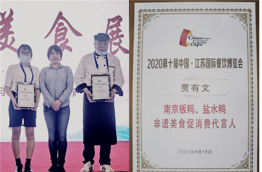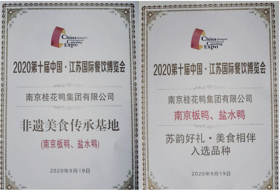 在“非遗美食展演”中,贾有文技师现场展演并介绍了桂花鸭的制作工艺,评委以及市民朋友品尝了桂花鸭,赞不绝口。通过展演评比,我公司荣获“非遗美食传承基地”,贾有文技师获得了南京板鸭、盐水鸭“非遗美食促消费代言人”。在19号上午“非遗美食大赏苏韵好礼·美食相伴选品会”上,经过评委们的品鉴和投票,我公司板鸭、盐水鸭成功入选。