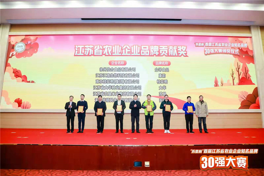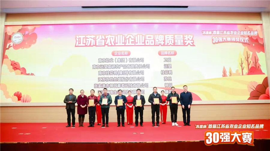 12月16日下午,“苏垦杯”首届江苏省农业企业知名品牌30强大赛总决赛在华东饭店圆满落下帷幕,经过激烈角逐,“桂花鸭”成功入选30强品牌,以综合评分第一名的好成绩摘得桂冠,同时获得“品牌贡献奖”和“品牌质量奖”两个单项奖励。江苏省副省长赵世勇出席颁奖仪式。公司党委书记夏青代表企业接受了颁奖。
