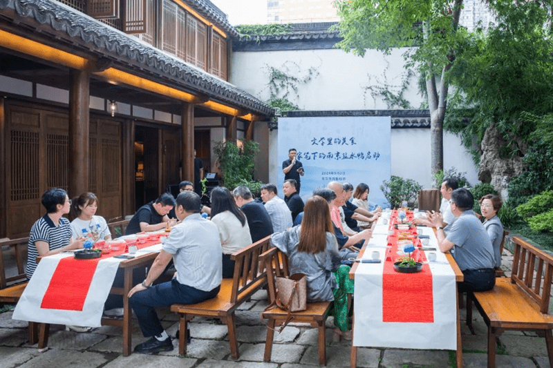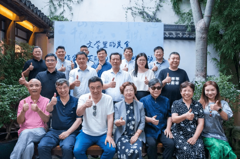 公司总经理徐伟与作家王干、储福金、姜利敏、沈乔生、杨莎妮,江宴餐饮、寻魏餐饮、樱桃鸭、盛源祥、今世鹏、金箔湖熟鸭业、湖熟板鸭负责人与省侨联文化交流部部长吕静、省绿色食品办公室主任徐继东、南京市侨联书记杨雯懿,南京市鸭产业链链长、市农业农村局副局长马洁峰,省餐饮行业协会会长于学荣、秘书长葛旭东、会长助理奴卉卉、美食艺术委总干事王苏源,省绿色食品协会秘书长燕东峰等共同启动文学里的美食——作家笔下的南京盐水鸭。