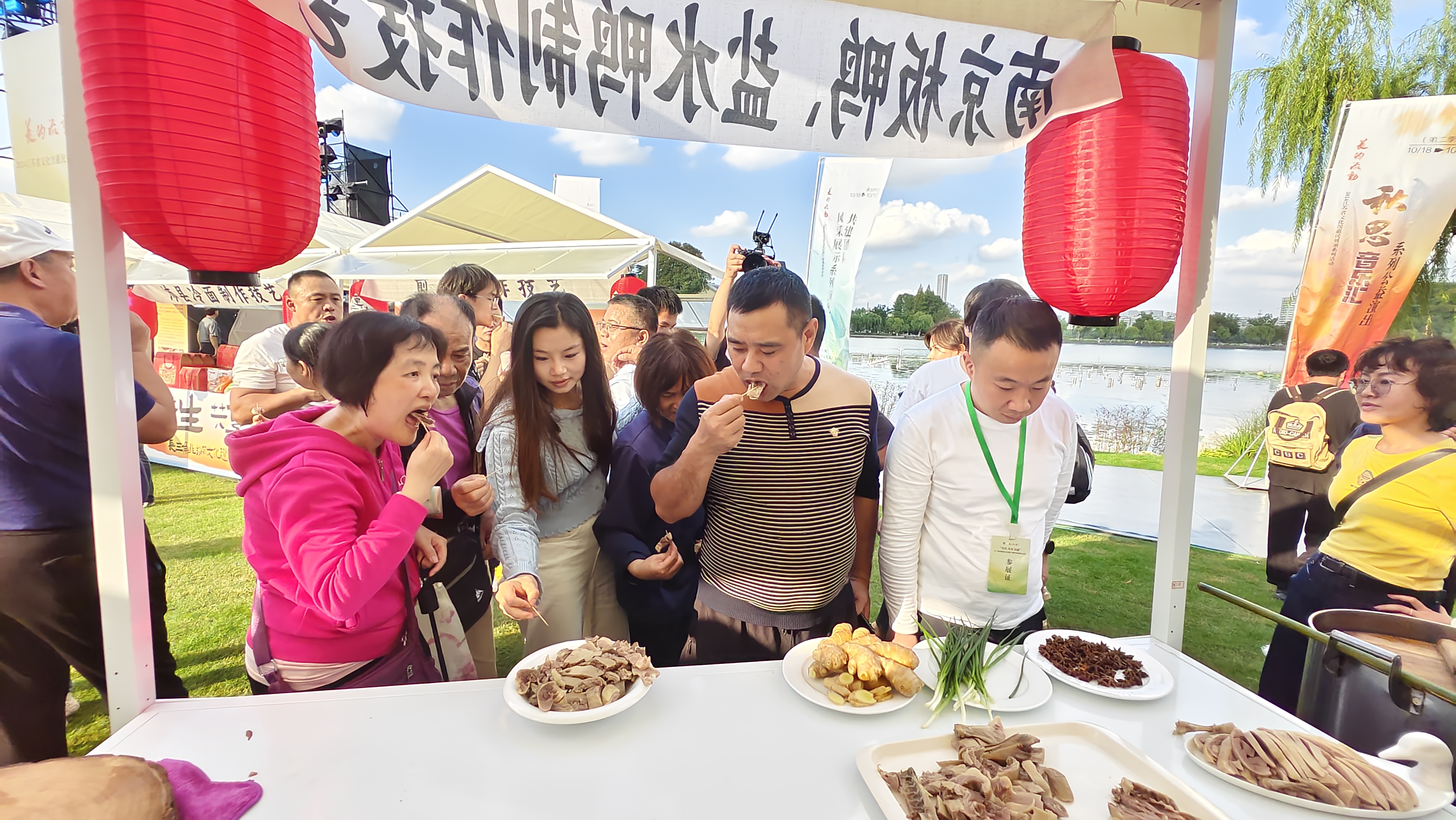 在活动现场,贾有文不仅展示了盐水鸭腌制、煮制、复卤等传统古法工艺,而且还将现场制作的盐水鸭,斩切给观众品尝,让观众从视觉到味觉,深层次地体验盐水鸭非遗项目。