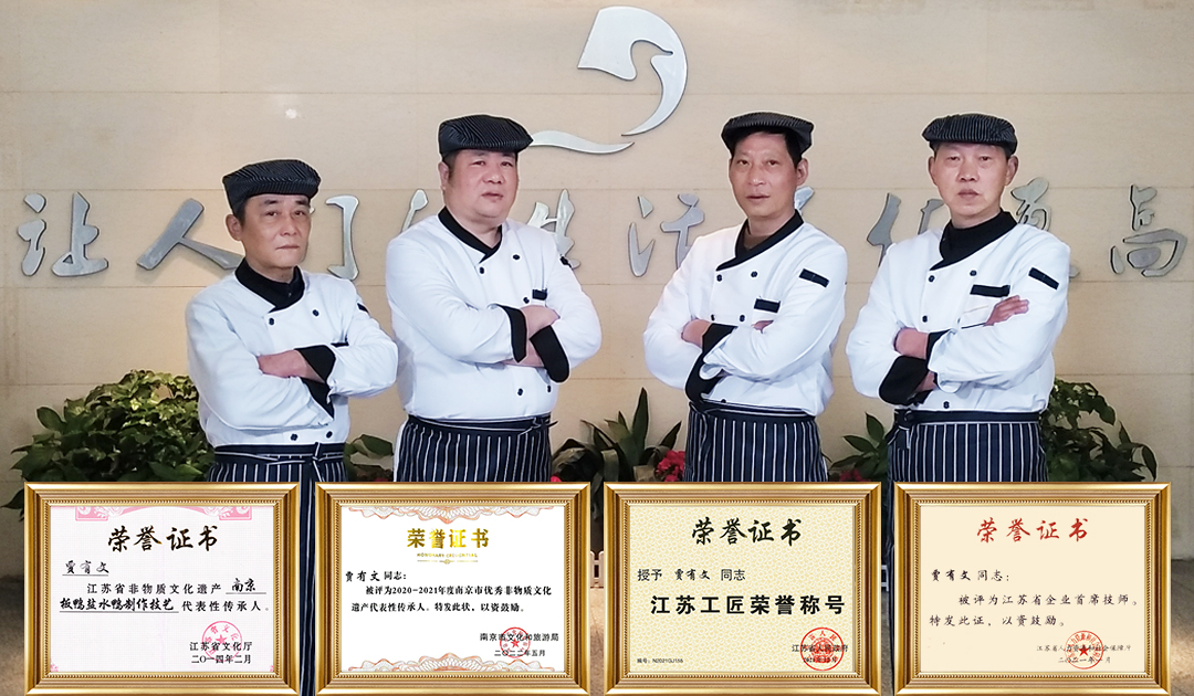 公司非遗传承首席技师,贾有文,于1967年11月出生于南京盐水鸭制作世家。1983年参加工作后,拜朱正元为师,学习盐水鸭制作工艺。2014年获得“江苏省非物质文化遗产传承人”荣誉称号。2021年获得“江苏工匠”和“江苏省企业首席技师”荣誉称号。2015年,他通过“贾有文技能大师工作室”传承鸭文化,传授新技艺。