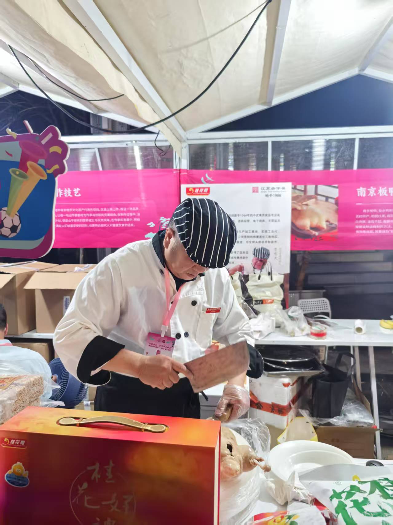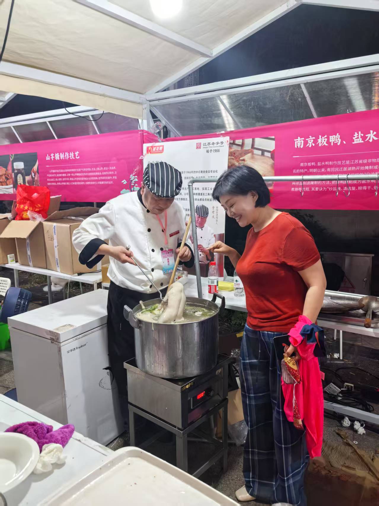 南京桂花鸭(集团)有限公司首席工艺师,省非物质文化遗产南京板鸭、盐水鸭制作技艺代表性传承人贾有文和其徒弟丁田田一起应邀出席了该活动。在活动现场,贾有文师徒用一锅热卤唤醒了大家的味蕾,让球迷们品味到了最地道的江苏烟火气。他们还现场演绎“炒盐腌、清卤复、烘的干、焐的足”的盐水鸭非遗工艺,那娴熟的手法就像变魔术一样,为大家开启了一场“超”乎想象的味觉狂欢。